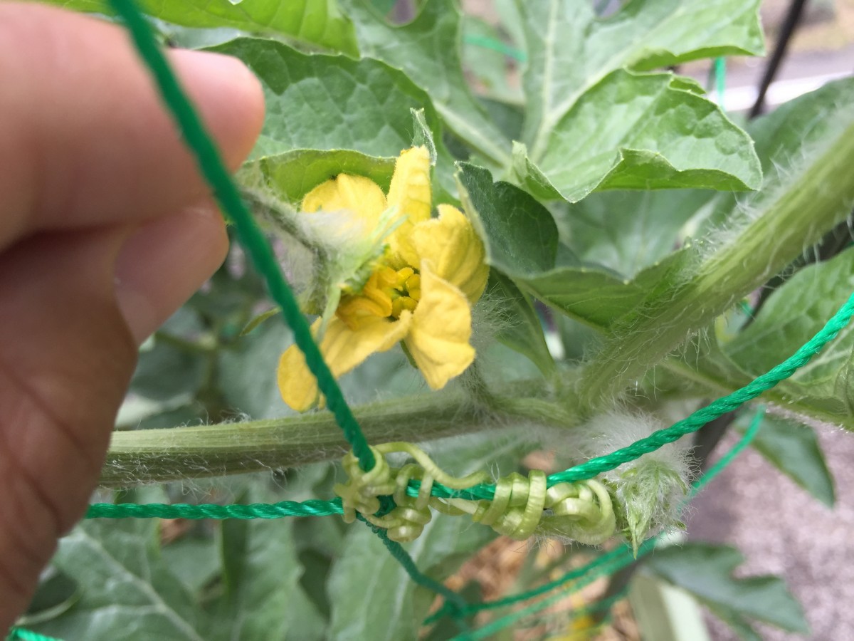 調べると、こんな方法が。雄花から直に雌花に花粉を付けちゃうそうです。といわけで、雄花を摘んで雌花につんつん。こんな感じでどうでしょうか。