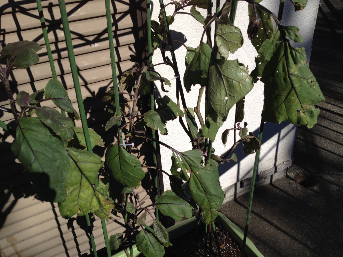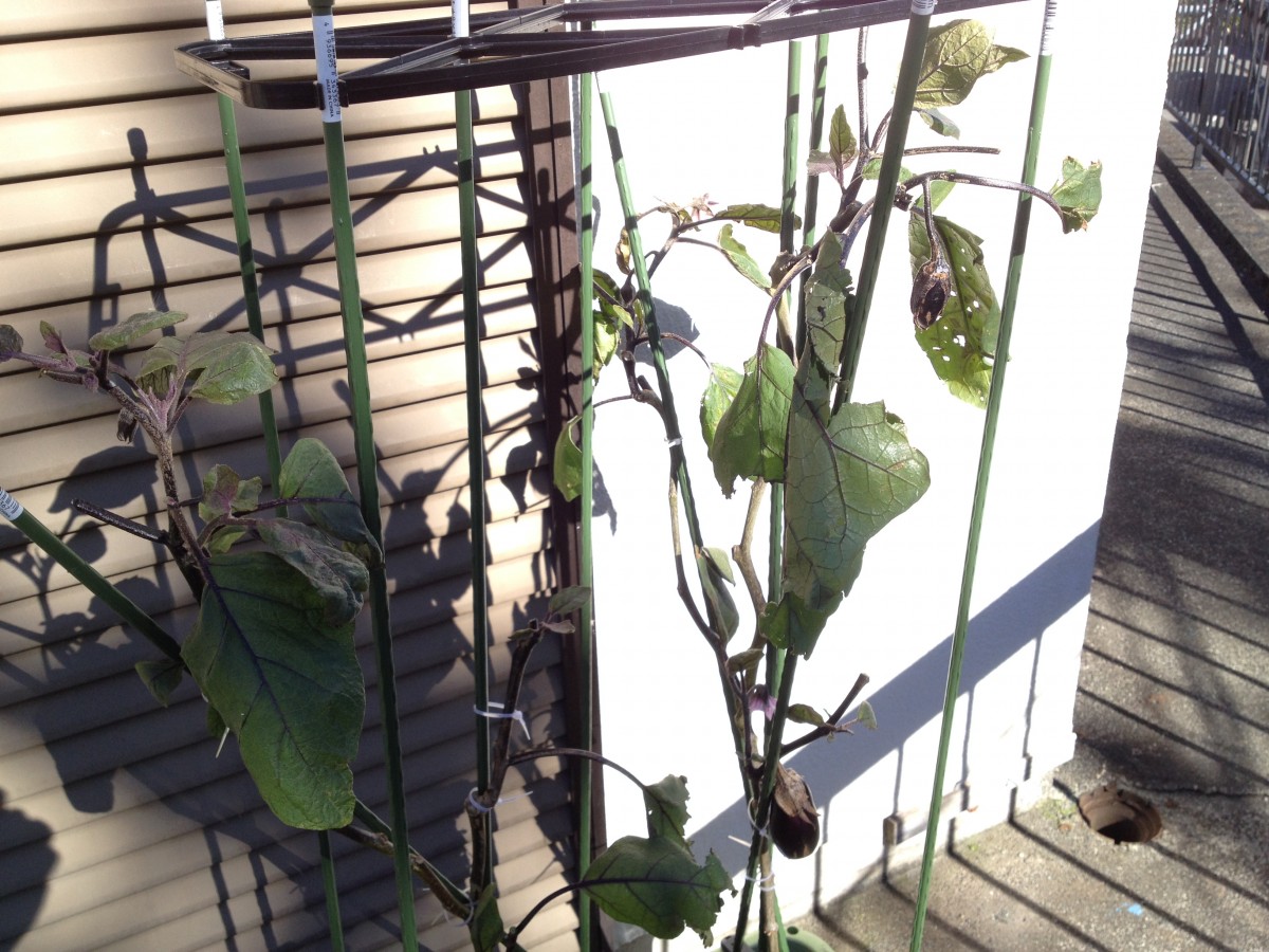 プランターのナス。暴風でボロボロ。ホコリダニに犯された部分を剪定。