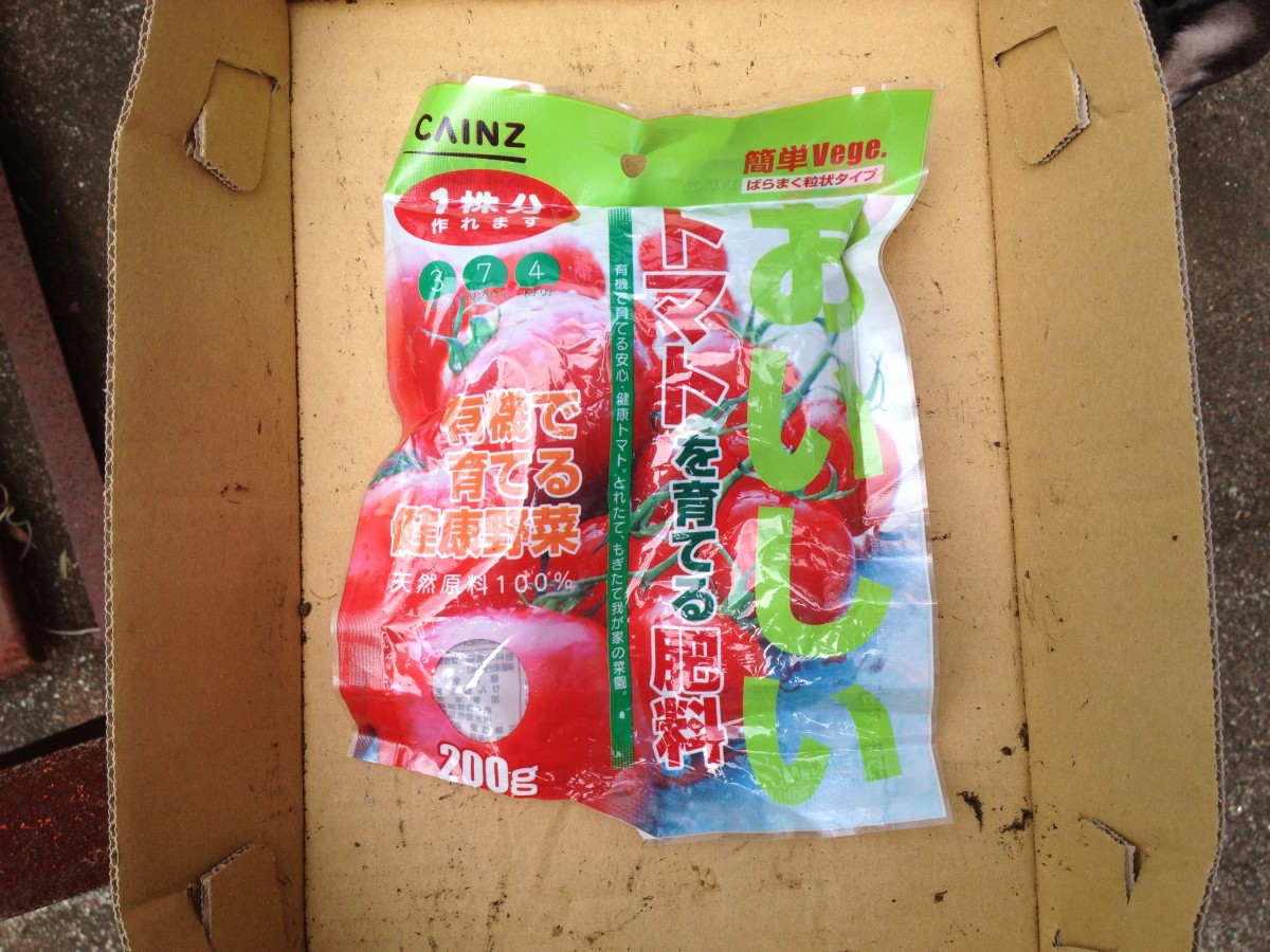 プランターでミニトマトを始めるときに追肥用に買っておいた肥料を使って、ミニトマトとナスに追肥をしてみます。