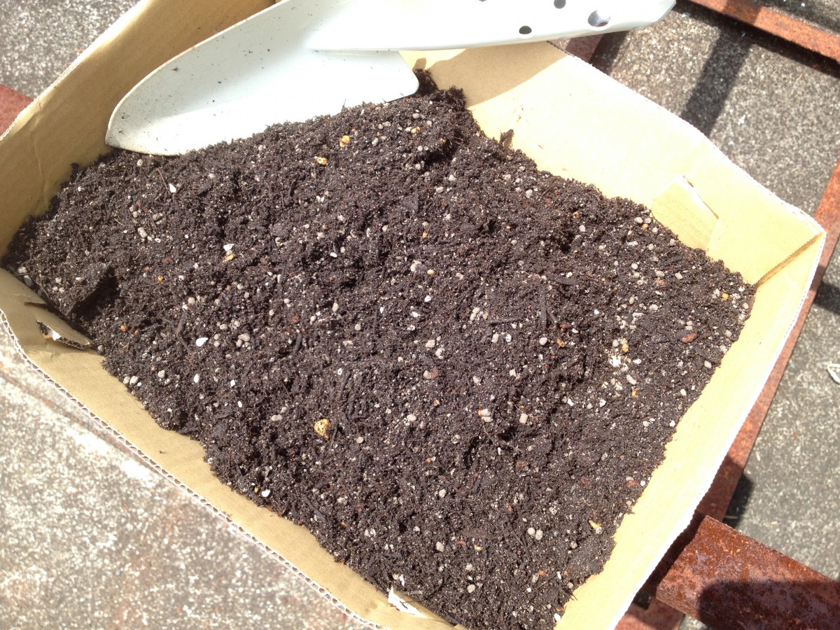 プランター用の土に「おいしいトマトを育てる肥料」をまぜる、まぜる。