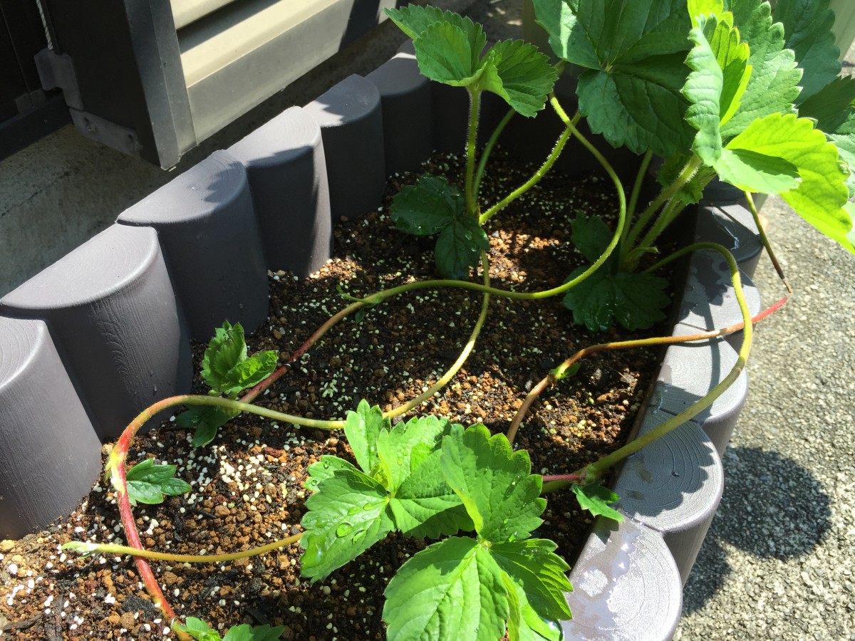やはり植え付けるタイミングが遅かったようです。葉ばかりが大きくなり、花は一つも咲かず、ランナーばかりが延び放題。しかたがないので新たなプランターでランナーを受けてみることにしました。