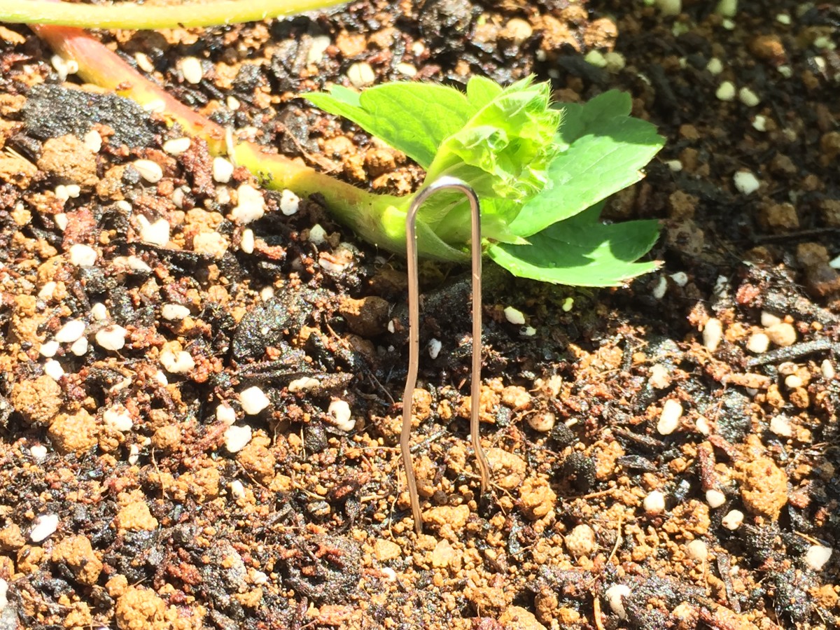 こんな金具(ただのクリップを延ばしたもの)を使ってランナーを地面に固定しました。