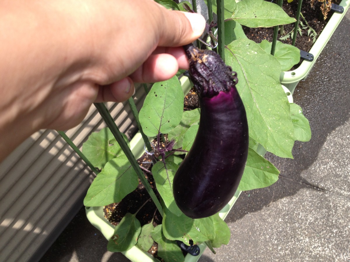 プランターにナスを植え替えてから18日目で収穫です。