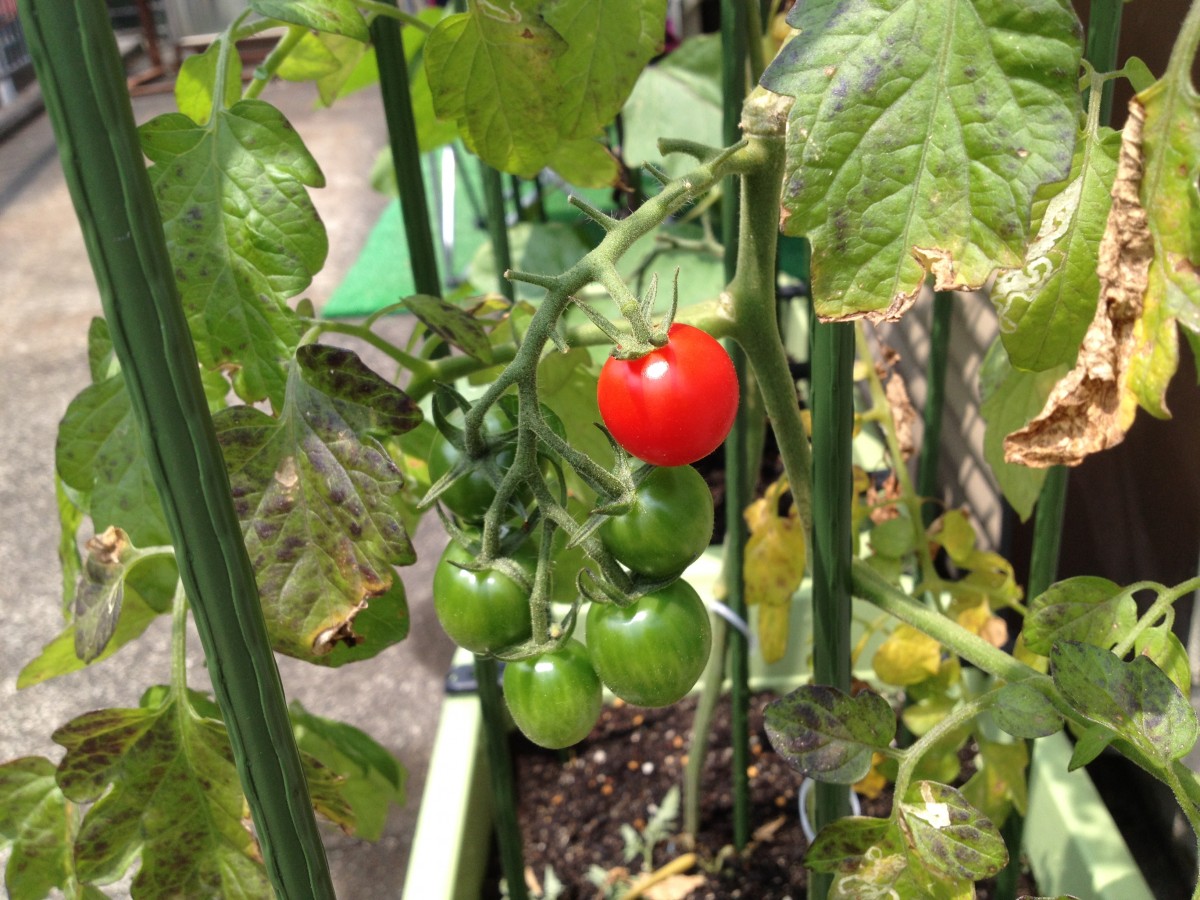 ミニトマトの収穫はもう暫くかかりそうです。一つだけ赤くなってる実はこのまま摘まないで少し様子を見守りたいと思います。