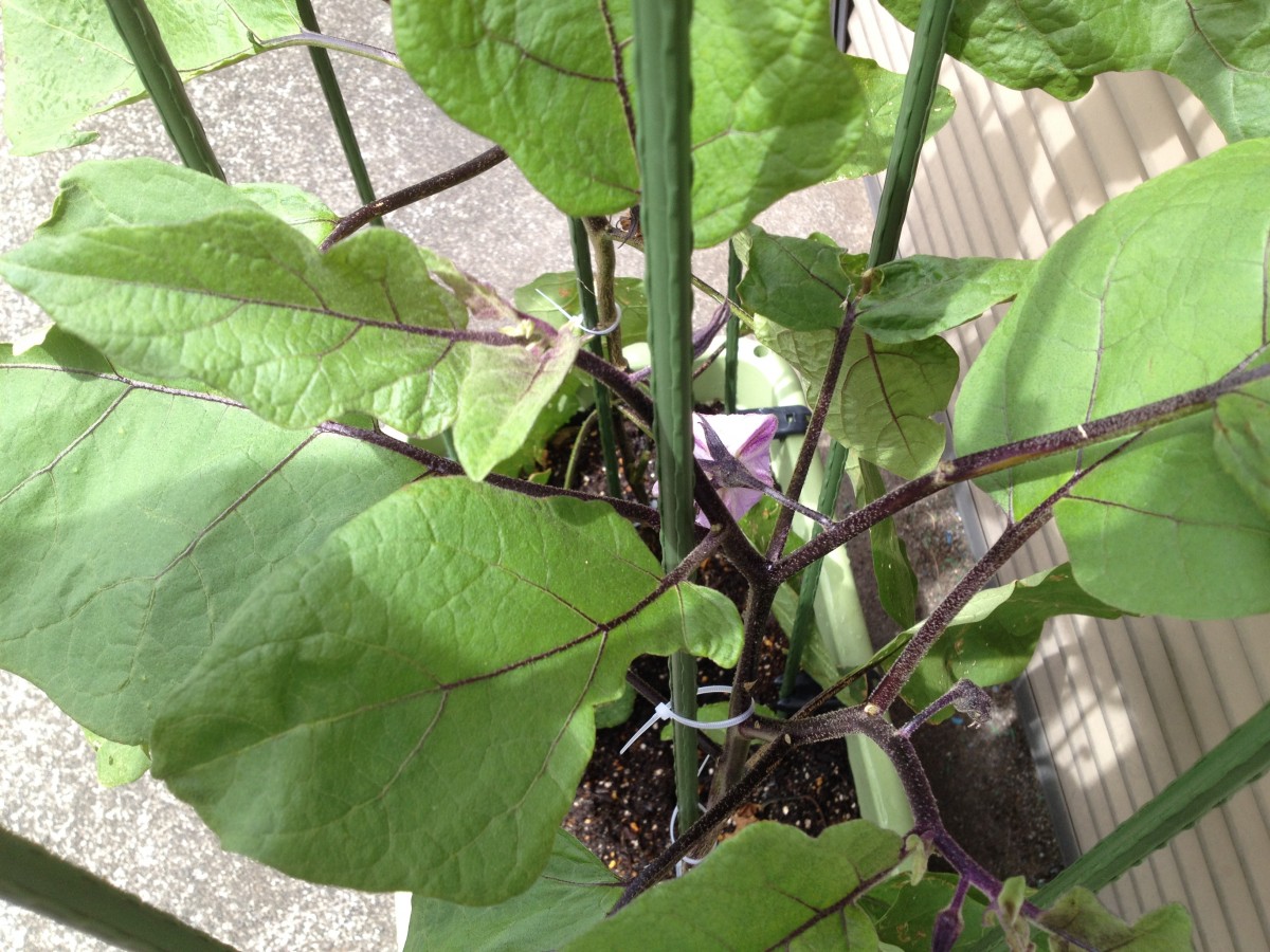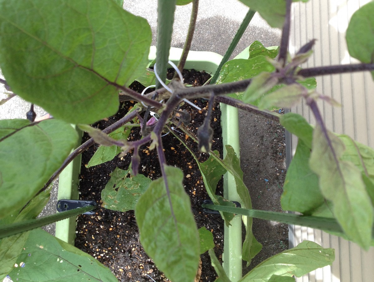 プランターで栽培中のナス。つぼみがあちらこちらから。