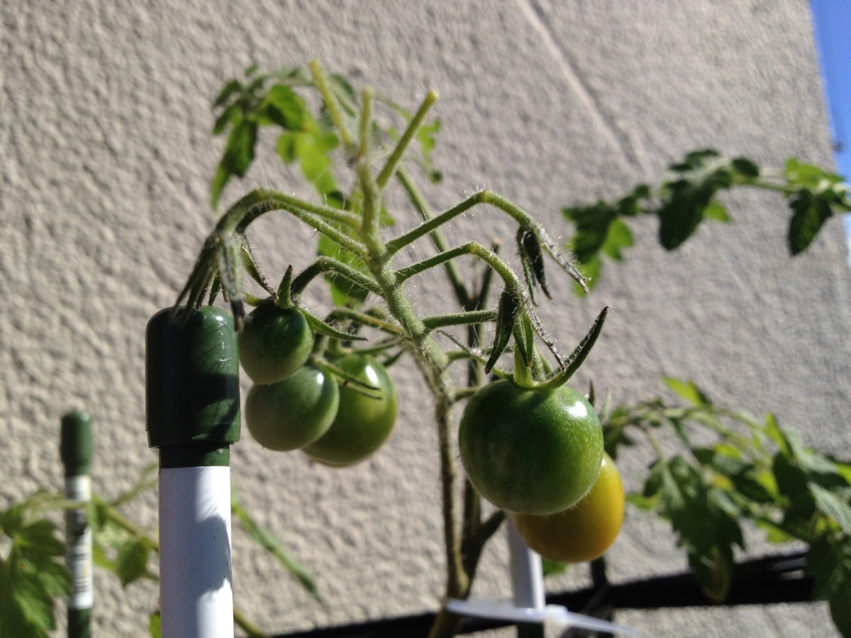 ミニトマトの先端部分。5房目のとこ。いくつかの花は実がつかないまま終わってしまいそう。