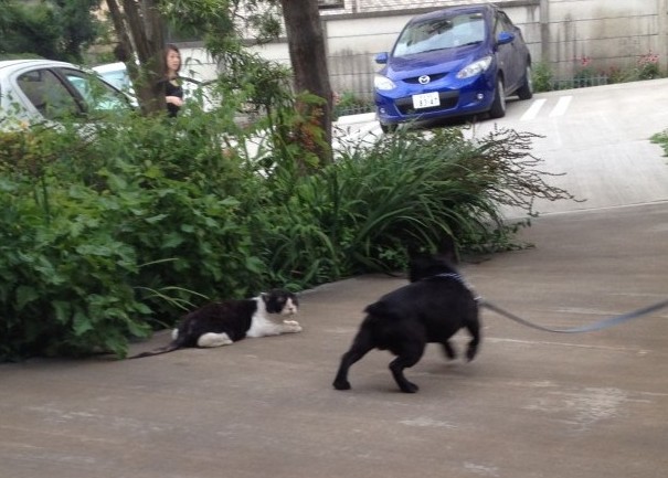 帰り際、不用意に猫に近づくも、案の定、怒られビビるぶんたくん。