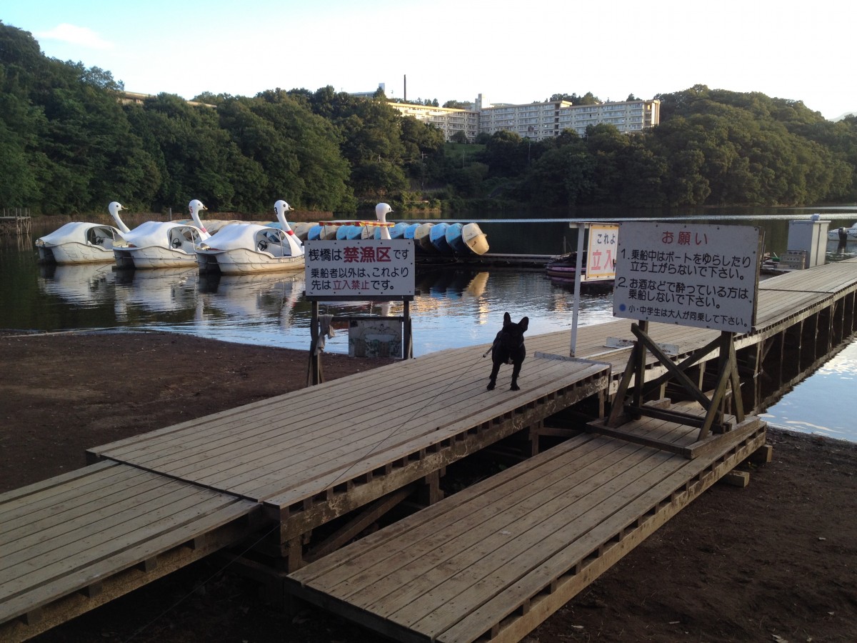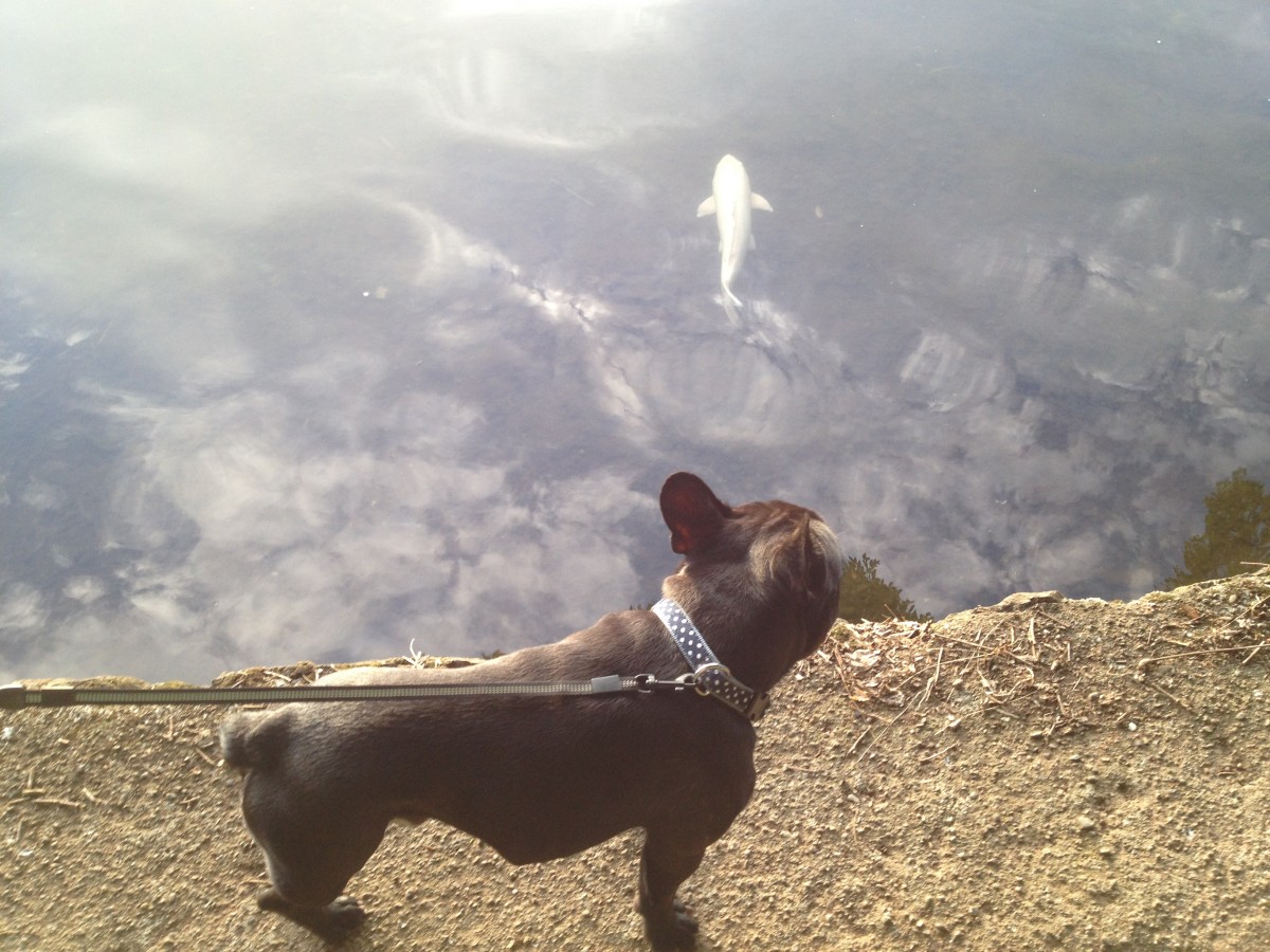 鯉とか鴨とかと戯れようと湖にやってきたフレンチブルドッグのぶんた。