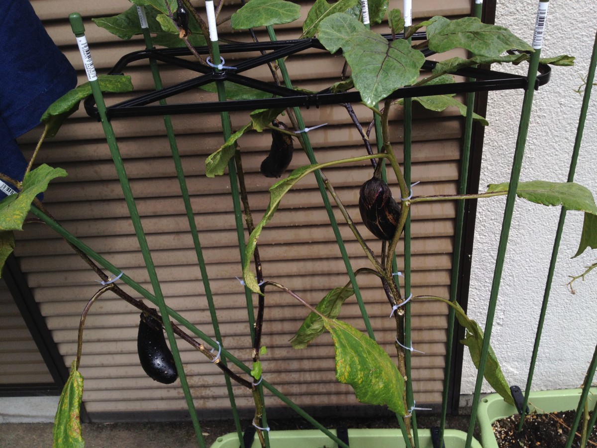株の先端に近い部分。枯れてから2〜3日ほど経ったナスの花。最近の傾向ですと、このまま育たずに落ちる可能性が大。ただ、よく見てみると、額の部分が若干ふくらんでいて、さわってみると、中に何かが詰まっている様な感触です。もしかしたらこのまま育つかも・・・といったところ。