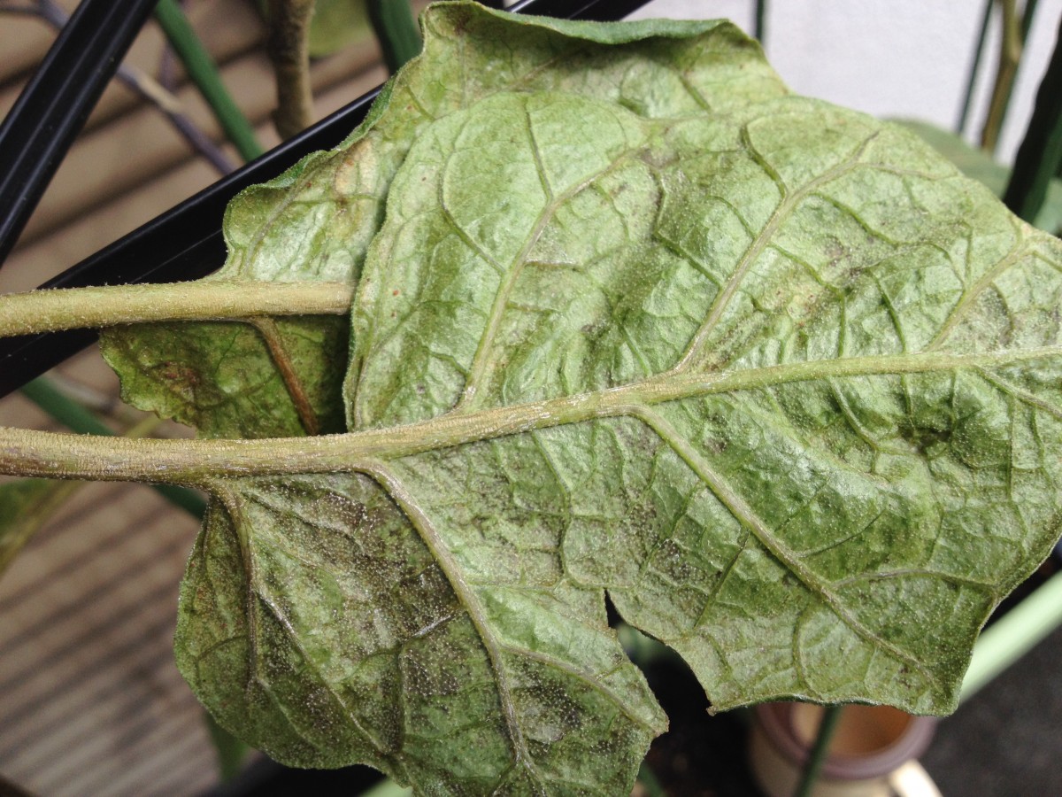 葉っぱの黒い模様ができて、白いカビの様なものが見られるようになりました。害虫?病気?時間のある時に調べてみることにします。