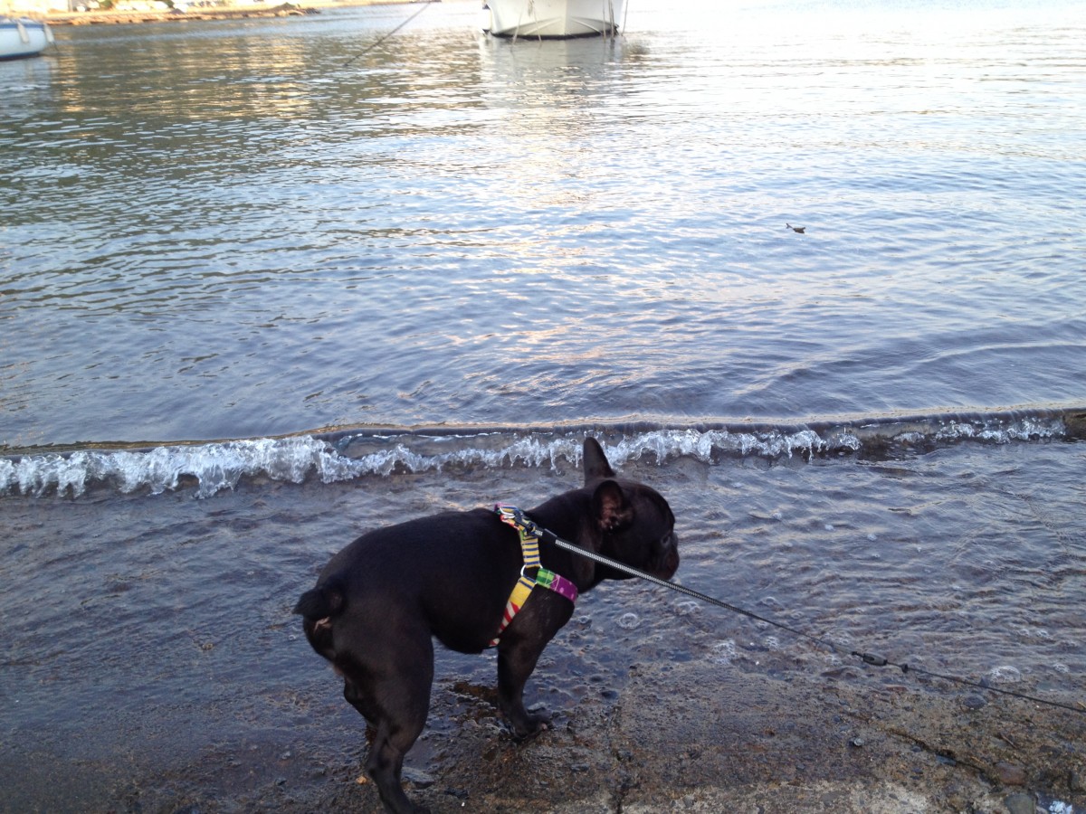 波打ち際とフレンチブルドッグ