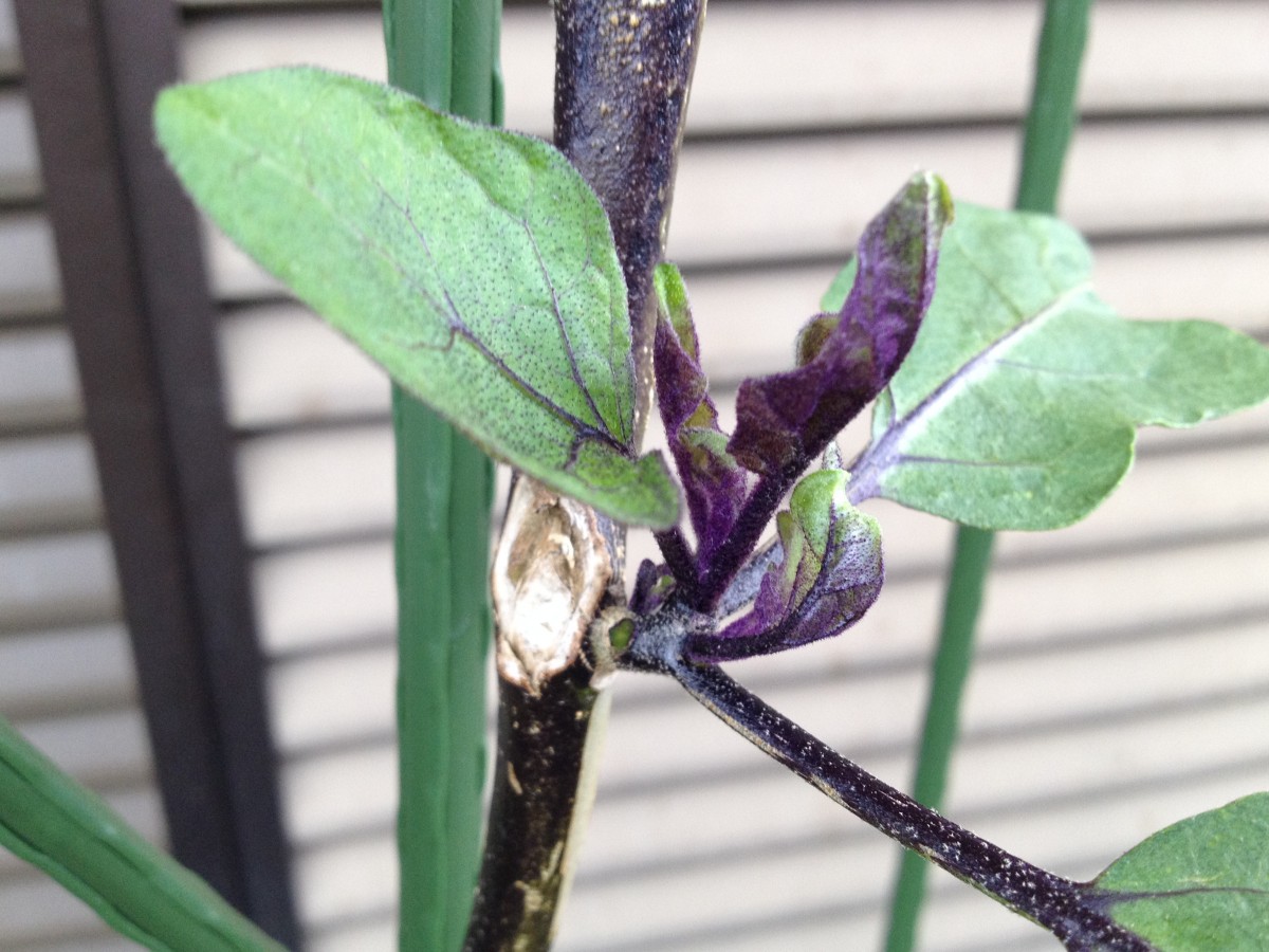 10日目のナス。育ちつつある脇芽と白い小さい虫。コナジラミ。