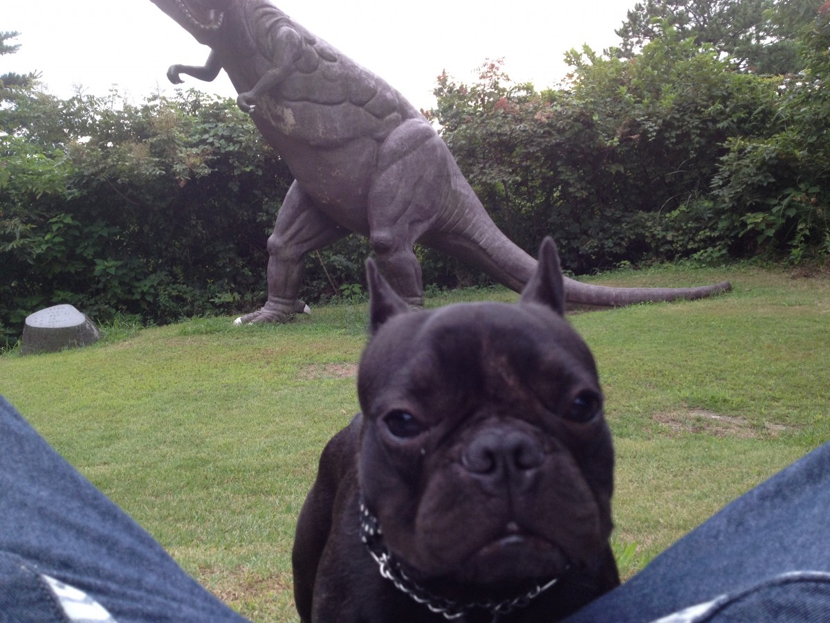 恐竜とフレンチブルドッグ。こちらは小室山の恐竜広場です。